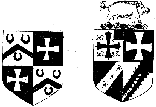 On the left, the Arms of Thurston De-Bower, Lord of the Manor of Little Longstone living in 1371, died in 1424. Arms on the left: NW and SE quartering, Sable, a cross patee argent.
