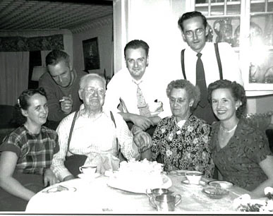 The Boston McTiernan family. Photo taken about 1943 in Boston. Front row: L to R: Kay Duffy, nee McTiernan, Michael "Pa" McTiernan, Katherine McTiernan, nee Morrissey and Marion Ganzel, nee McTiernan. Back row: L to R: Charles McTiernan, Phillip McTiernan and Joseph McTiernan.