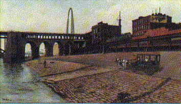 An old photo of the St. Louis levy on the Mississippi River with the famous Arch imposed in the background. The right hand top corner building is The Switzer Licorace Company. I worked there one summer as a kid when it was still in business. We sat outside on the roof for lunch and watched foot long rats swim in the river.