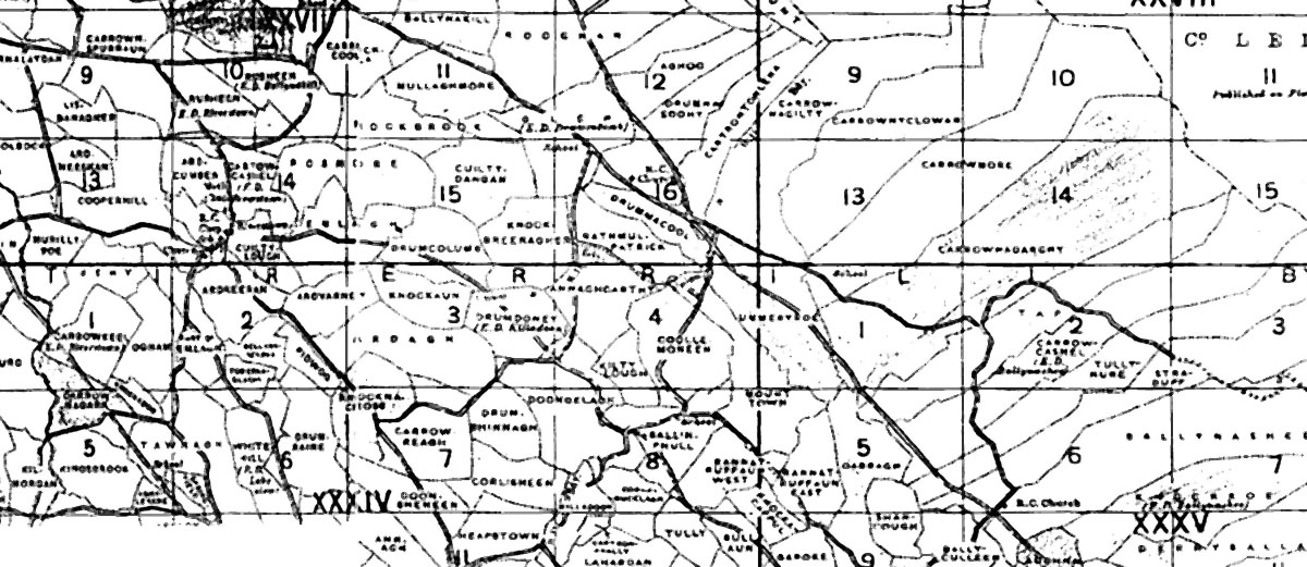 McTernan / McTiernan townlands in Co Sligo Tawnagh, in the lower left in Sq #5 & 6, to the right of the number 5 Heapstown, almost in the center on the bottom line, above the word "in" Ummeryroe, off to the right from center in both Sq #4 & Sq # 1 about half way up Carowmore, top right corner in Sq # 10, on the Leitrim border Carrownadagny, top right corner in Sq # 14, on the Leitrim border Tap, on right side in Sq # 2, to the right of Ummeryroe, on the Leitrim border Shancough, lower right corner in Sq # 9, right from Heapstown