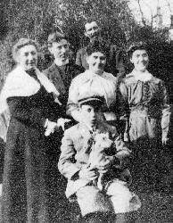 Hugh McTiernan VI and his wife Anne McGrail in front of him. Father Catterland and Father's mother on the left. Theresa Curran, a cousin of Anne McGreal is on the right. Photo taken about 1911 at their family's Thomas St. house in St. Louis, MO USA. John Francis McTiernan 1901--1989 is the kid sitting with his dog Teddy.